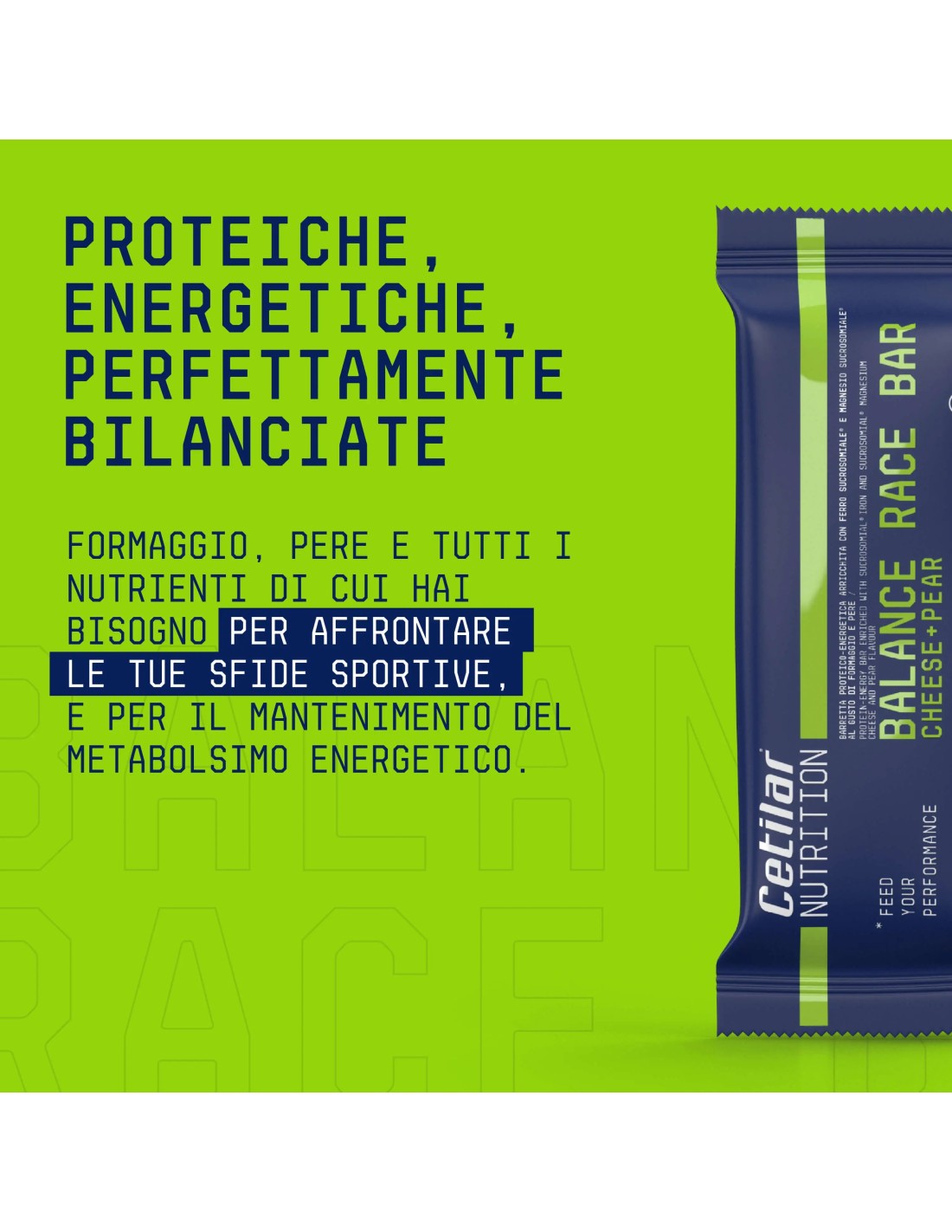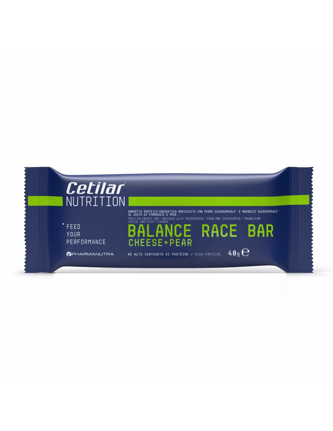 Balance Race Bar Cheese + Pear è un alimento funzionale per sportivi formulato per supportare le richieste metaboliche indotte dall’esercizio fisico attraverso una ripartizione razionale dei macronutrienti 40-30-30 (carboidrati-proteine-lipidi).