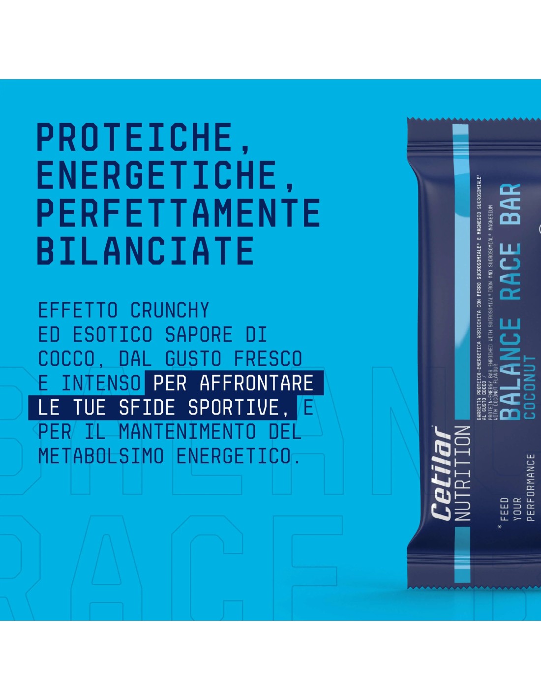 Balance Race Bar Coconut è un alimento funzionale per sportivi progettato per sostenere le richieste metaboliche indotte dall’attività fisica attraverso una combinazione sinergica di macronutrienti ad alta densità nutrizionale.